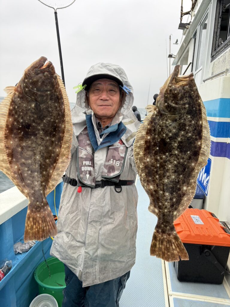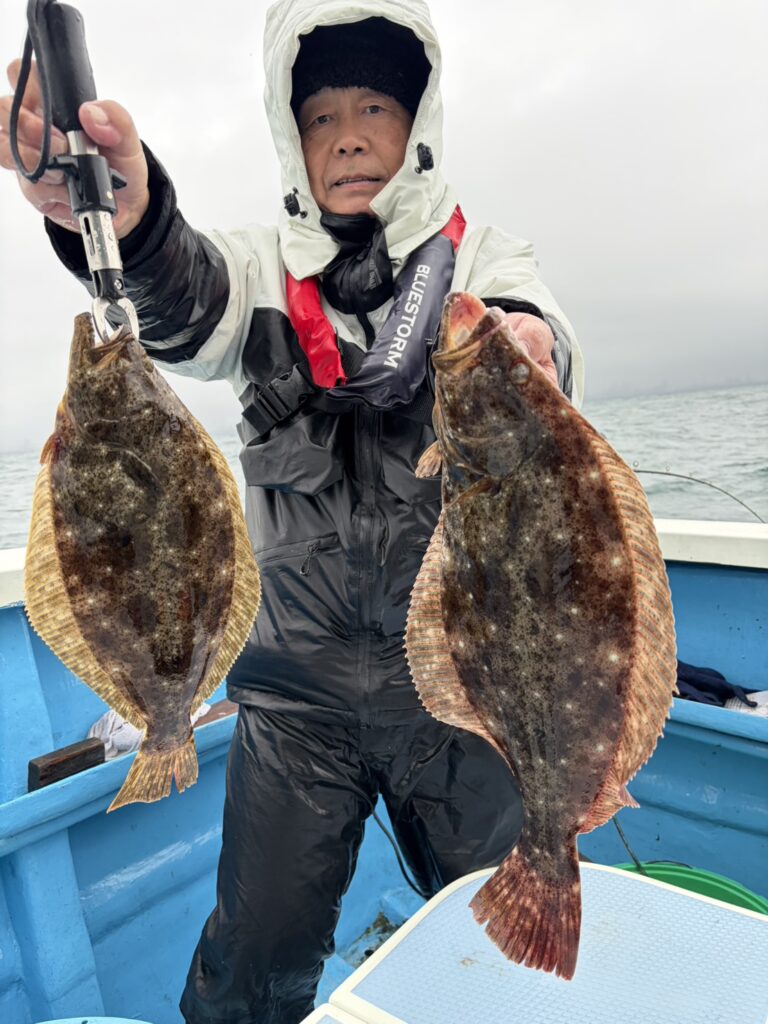 本日は朝から雨の中、ヒラメはポツポツ型は出るものの小振りでした。皆様寒い中お疲れ様でした。明日もヒラメ船に出船します。ご予約受付中です。