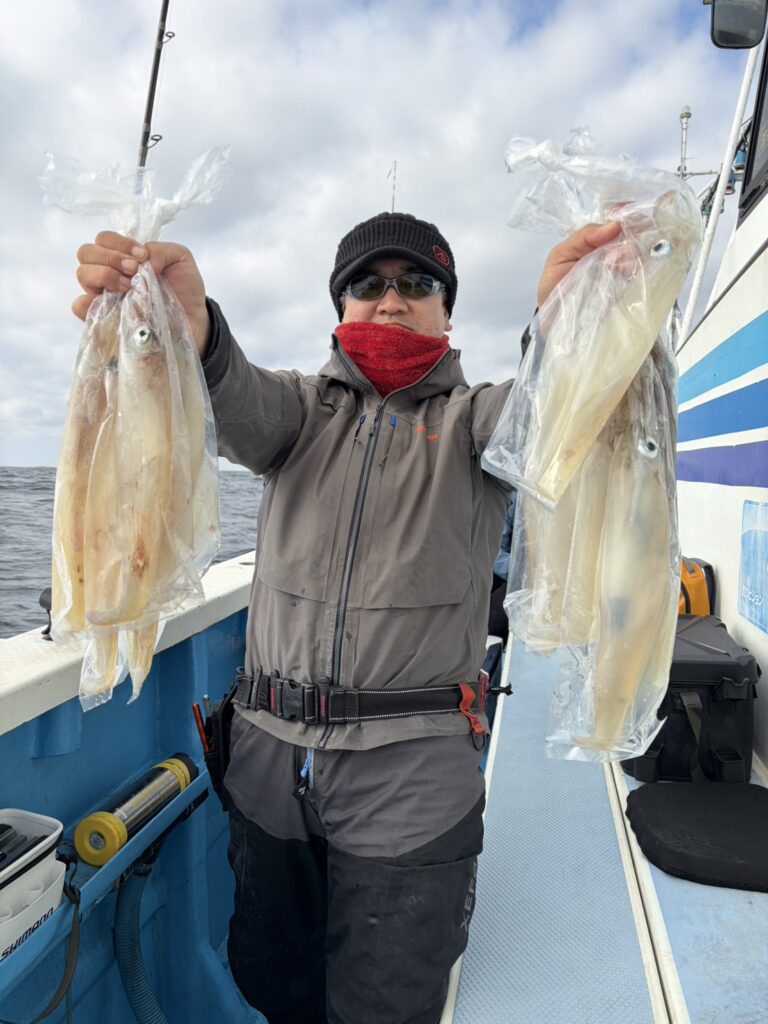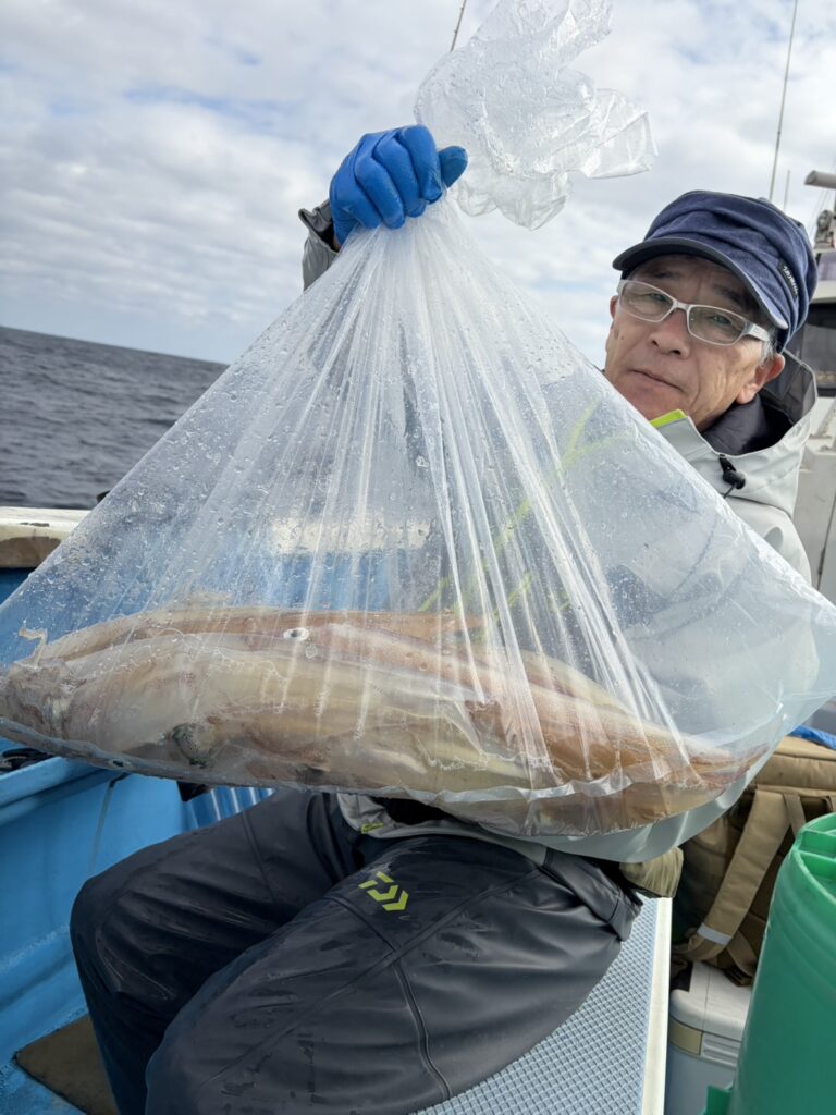 水深140〜150mで朝からポツポツと掛かり、5点掛けも見られ、皆さんお土産になりました。オモリ150号。明日は定休日になります。今後もヤリイカ船に出船予定、ご予約受付中です。