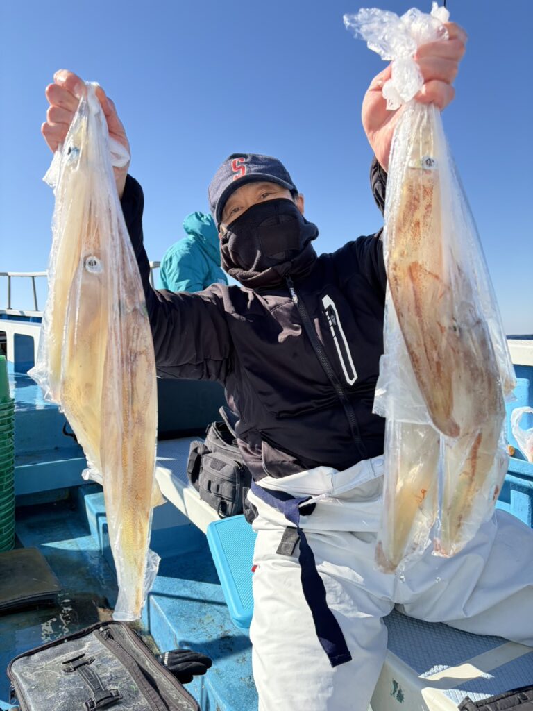 水深140mで、イカはポツリポツリの乗りでたまに3点掛けも見られました。お一人が型見ずでした。今後もヤリイカ船に出船します。