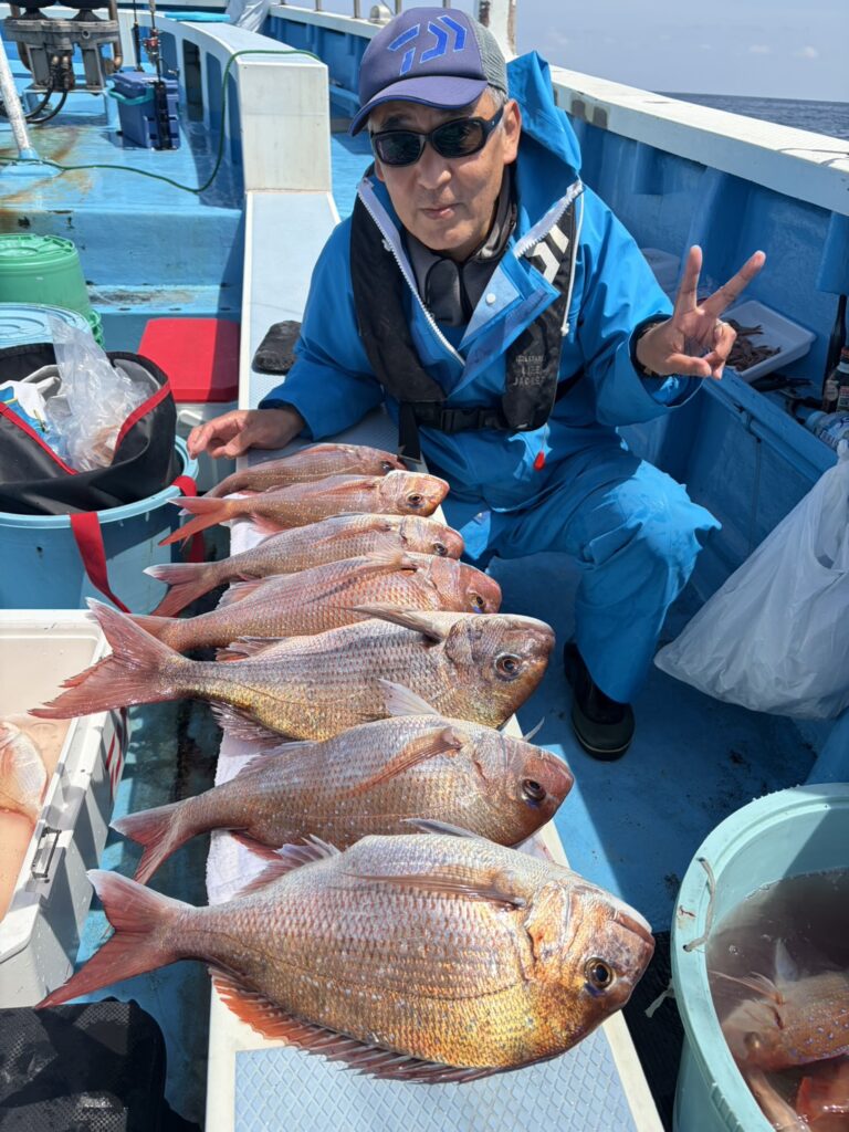 本日は朝のうち好調に掛かり、その後もポツポツと釣れて、見事大鯛6.74キロ、その他中鯛3.26キロ2.56キロなど良型から美味しいサイズまで皆さん良いお土産になりました。明日は出船中止で、明後日はテンヤ真鯛船に出船します。