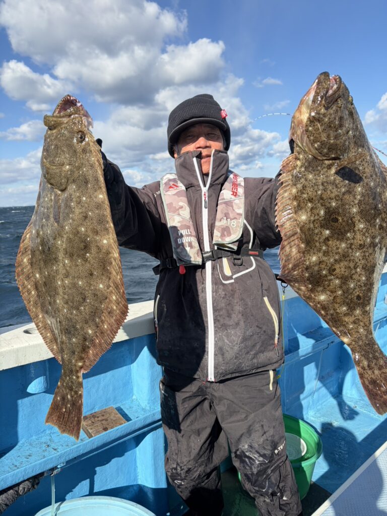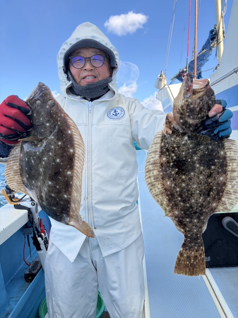 本日は一日風強く、ヒラメは平均3〜4枚で0は船酔いの方でした。寒い中、皆様お疲れ様でした。明日もヒラメ船に出船します。体調管理と防寒対策は万全でお越し下さい。