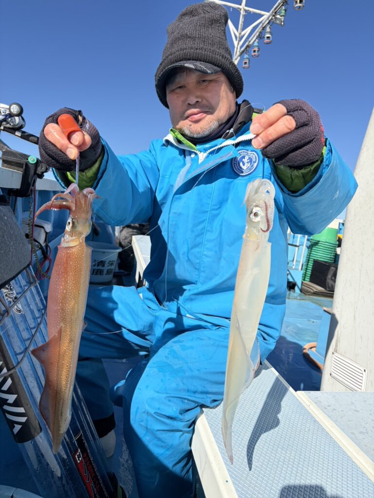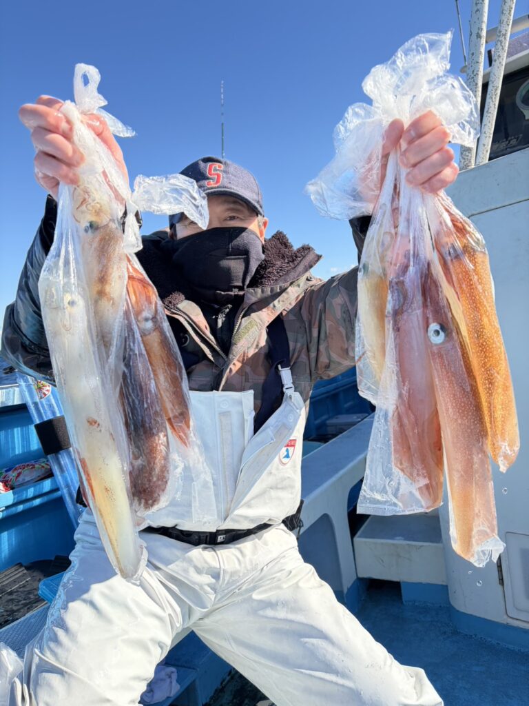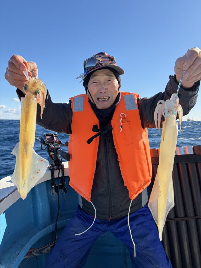 水深140〜150mでポツポツ乗って、型が良いので皆さんお土産になりました。オモリ150号。明日もヤリイカ船に出船します。ヒラメ船もご予約受付中です。